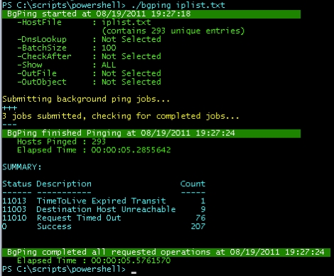 “BgPing.ps1 is a Background Ping Script capable of pinging enormous hosts lists in record time. You could call it a Bulk Ping Script, a Mass Ping Script, a Batch Ping Script or even a Mega Ping Script but the bottom line is: this baby will crank through a lot of IP addresses (or hostnames) very quickly.”